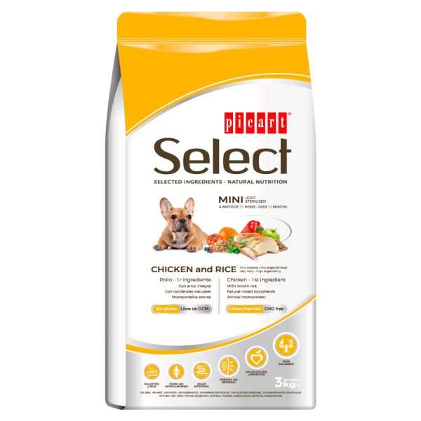 סלקט מיני לייט/מסורס הנו מזון בעל נוסחה חדשה שפותחה במיוחד של ידי חברת ®Picart הספרדית לצרכיהם התזונתיים של כלבים מסורסים, כלבות מעוקרות, וכלבים בעלי נטיה להשמנה או משקל עודף. המזון מופחת שומן, ומתוסף בתאית לאיזון המשקל.
